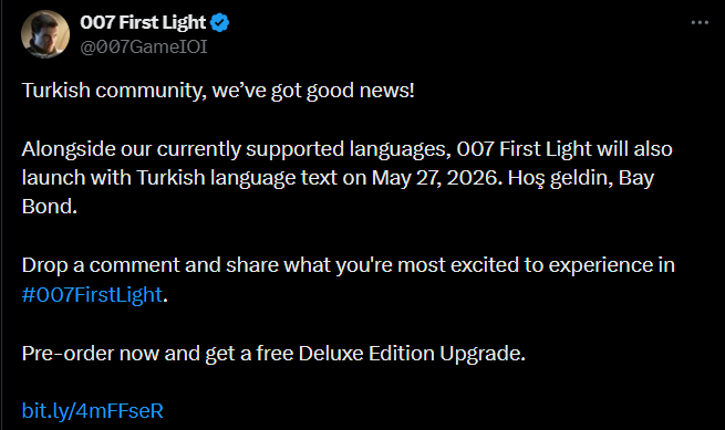 “Şu anda desteklediğimiz dillerin yanı sıra, 007 First Light oyunu 27 Mayıs 2026'da Türkçe metin seçeneğiyle de piyasaya sürülecektir. Hoş geldin, Bay Bond.” #007FirstLight 'da deneyimlemek için en çok heyecan duyduğunuz şeyi yorum olarak paylaşın. Şimdi ön sipariş verin ve ücretsiz Deluxe Sürüm Yükseltmesi kazanın.