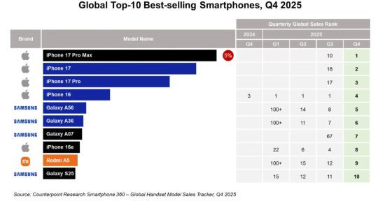 Counterpoint Research verilerine göre Apple’ın iPhone 17 Pro Max modeli, 2025’in dördüncü çeyreğinde dünya genelinde en çok satan akıllı telefon oldu. Onu sırasıyla iPhone 17, iPhone 17 Pro ve iPhone 16 takip etti. Samsung’un Galaxy A56 modeli ise beşinci sırayı alarak söz konusu dönemde dünyanın en çok satan Android akıllı telefonu olmayı başardı.