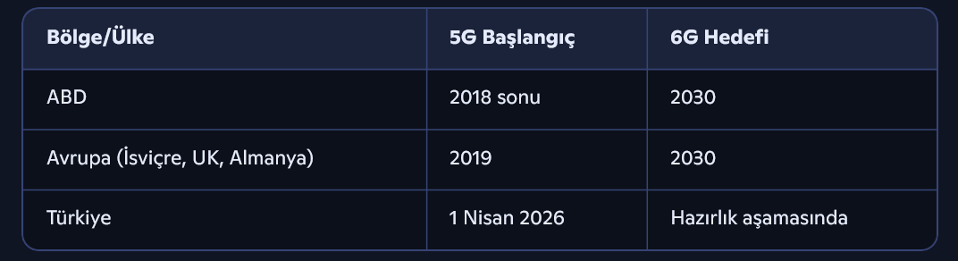 Türkiye, 5G’ye geçiş için 2026 tarihini hedeflerken, dünya genelinde 6G için belirlenen tarih 2030. Bu da demek oluyor ki, Türkiye 5G’ye adım attığında, küresel teknoloji devleri çoktan 6G altyapısını kurmaya başlamış olacak.
