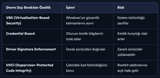Bu özelliklerin kapatılması, sistemin antivirüs tespitinden kaçan kötü amaçlı yazılımlara karşı savunmasız hale gelmesine neden oluyor.