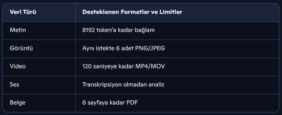 - Metin, görsel, ses ve video gibi içerikler aynı anda modele gönderilebiliyor.
