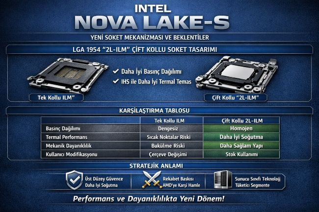 Nova Lake-S’in LGA 1954 soketinde çift kollu ILM kullanımı, masaüstü işlemci dünyasında küçük gibi görünen ama büyük etkiler yaratabilecek bir yenilik. Intel, bu tasarımla yalnızca performans değil, aynı zamanda güvenilirlik ve kullanıcı deneyimi açısından da çıtayı yükseltmeyi hedefliyor.