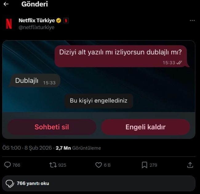 Paylaşımda, dublajlı izleyenlerin tiye alındığı bir mesajlaşma ekran görüntüsü vardı. “Dublaj mı altyazı mı?” sorusuna “dublaj” cevabı verildiğinde karşı tarafın engellemesi, doğal olarak birçok kişiyi rahatsız etti. Çünkü bu, dublajı küçümseyen bir yaklaşım olarak algılandı.