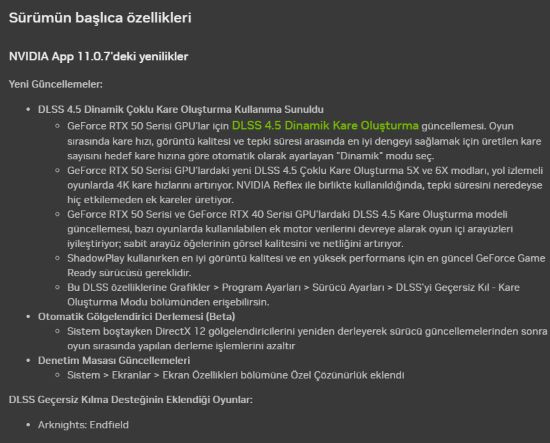 Yeni yayınlanan 11.0.07 NVIDIA App ile birlikte gelen DLSS 4.5 Dinamik Çoklu Kare Oluşturma özelliği ve Otomatik Gölgelendirici Derlemesi 'de yine bu sürümde karşımıza çıkıyor.