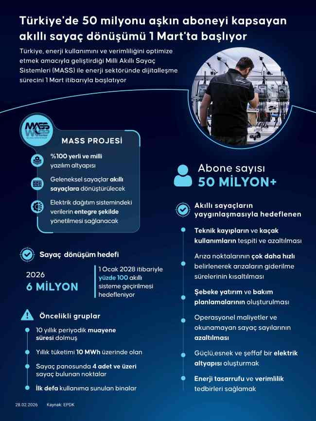 Enerji Piyasası Düzenleme Kurumu (EPDK) tarafından belirlenen usul ve esaslar doğrultusunda, Türkiye genelinde elektrik dağıtım şirketleri tarafından uygulanacak Milli Akıllı Sayaç Sistemleri (MASS) projesi, 1 Mart itibarıyla hayata geçiriliyor.