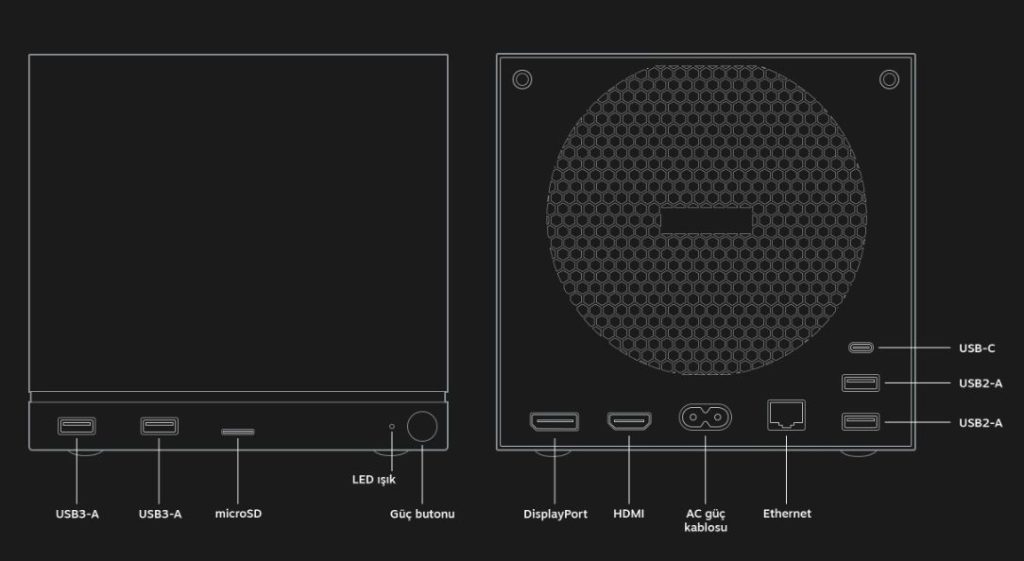 USB : Önde iki adet USB-A 3.2 Gen 1 girişi, Arkada iki adet yüksek hızlı USB-A 2.0 girişi, Arkada bir adet USB-C 3.2 Gen 2 girişi