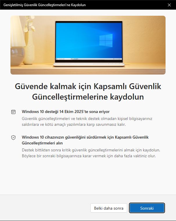 Windows 11’e güncellenemeyen cihazlar için ise Microsoft, Windows 10 Tüketici Genişletilmiş Güvenlik Güncelleştirmeleri (ESU) adlı yeni bir program başlattı. Bu program, yalnızca kritik güvenlik yamalarını içeren sınırlı güncellemeler sunacak; özellik eklemeleri, hata düzeltmeleri veya teknik destek sağlamayacak.